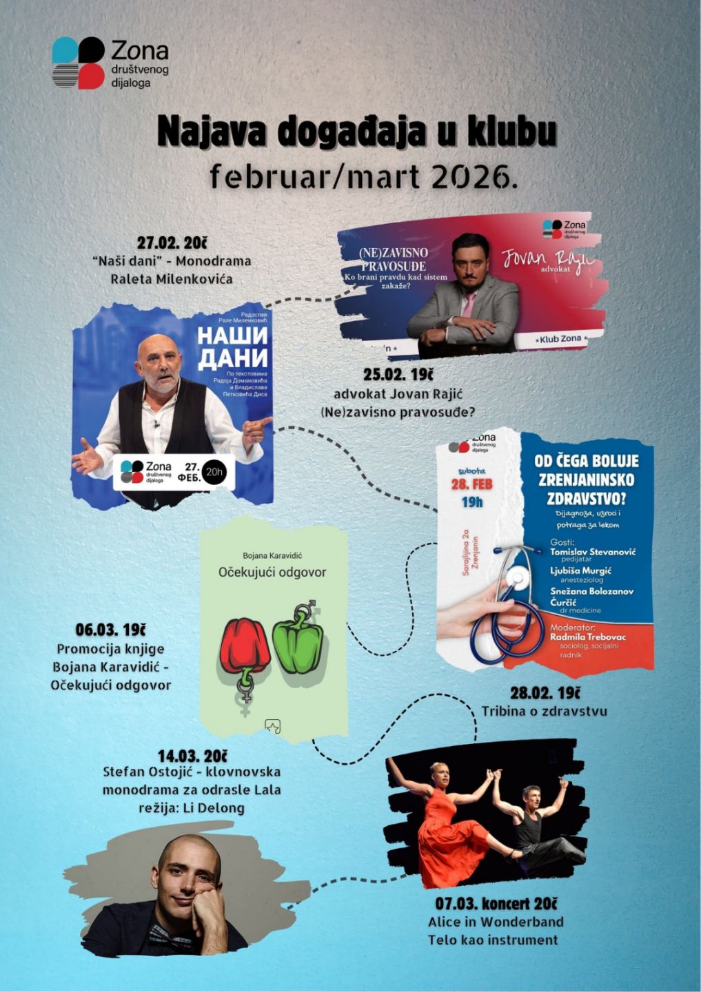 kafe klub Zona JEDINSTVENO MESTO U ZRENJANINU Udruženje ZONA DRUŠTVENOG DIJALOGA osnovalo je kafe klub u centru Zrenjanina.Prostor je uređen kao mesto pogodno za razgovor, predstavljanje i razmenu ideja, sticanje novih znanja i poznanstava, u opuštenoj atmosferi. centar grada 50 sedećih mesta projektor brz internet ketering mogućnost iznajmljivanja saznajte više Najnoviji događaji DogađajiRazgovorDejan Šoškić – Istine i zablude o ekonomskoj situaciji u Srbiji DebataDogađajiNebojša Milenković – Nije se srušila samo nadstrešnica, urušila se država DogađajiDijalog u paklu između Makijavelija i Monteskjea – javno čitanje DogađajiPromocija knjigePromocija knjige Srđana Cvijića “Vixere” DogađajiPredstavljanjeVinsko veče Pretraga događaja Debata (6) Događaji (33) Predstavljanje (1) Promocija knjige (6) Razgovor (1) Tribina (5) nAJGLEDANIJI VIDEO NA NAŠEM YOUTUBE KANALU dobrodošli u Zonu društvenog dijaloga POGLEDAJTE VIŠE SLIKA U GALERIJI